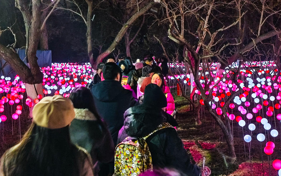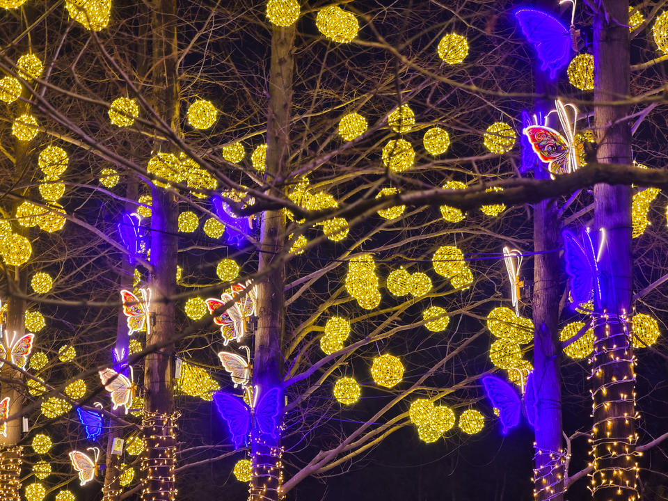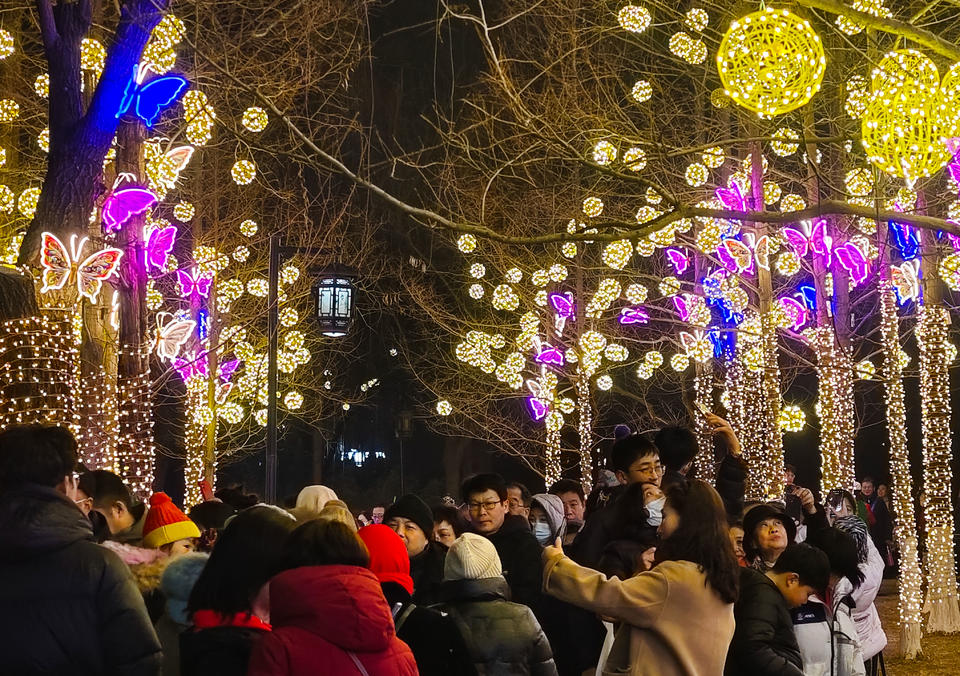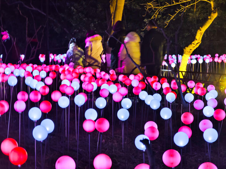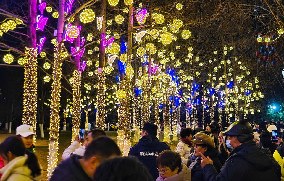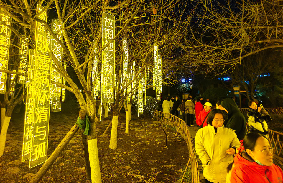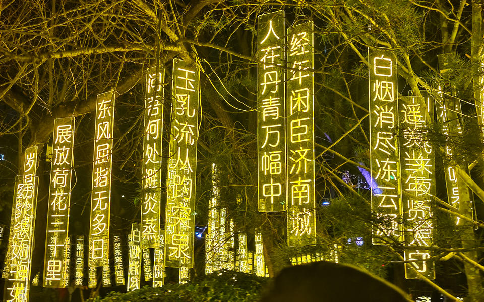 树林间的蝴蝶和星光仿佛仙界;数千个彩色灯球犹如郁金香花丛;而成片的诗词灯组更是充满文化和历史感,让搭客们惊喜。