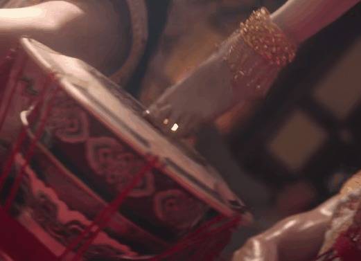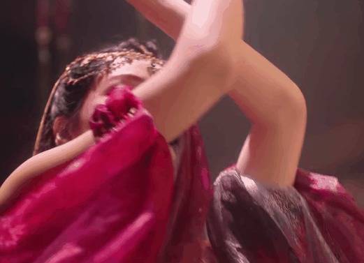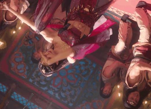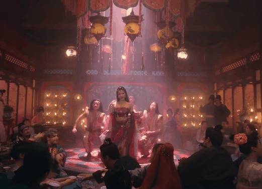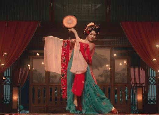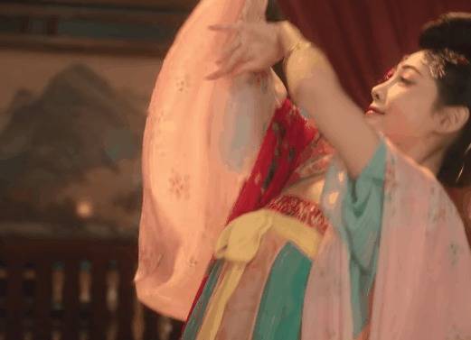 只见舞姬舞动着婀娜的身段在台上转圈,运镜与她的舞姿齐备和会。
