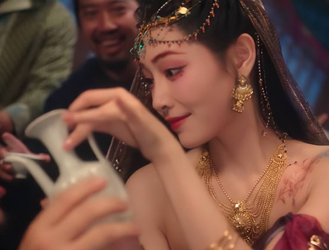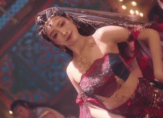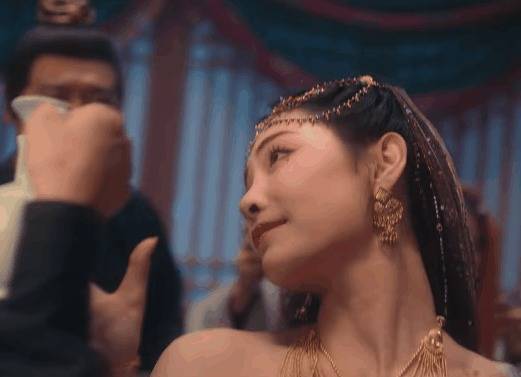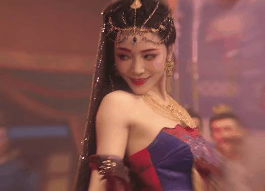 黄灿灿的头饰恰到刚正,妆容美艳,两只眼睛下方点缀的红色小钻号称点睛之笔,让舞姬的姿色愈加动东谈主。