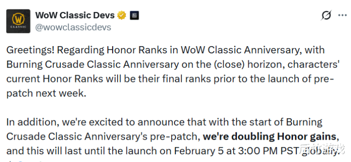 《魔兽寰球》20周年服行将在1月15日更新到TBC前夜版块,荣誉系统将迎来一波大袭击,旧的军阶轨制铲除,称呼绝版,将使用荣誉点数兑换60级的PVP荣誉装备。而字据最新蓝贴,前夜时期,总计荣誉值的得回量将翻倍。这也意味着在2月6月TBC端庄上线前,玩家不错应付刷满一套荣誉装,便捷背面的练级。