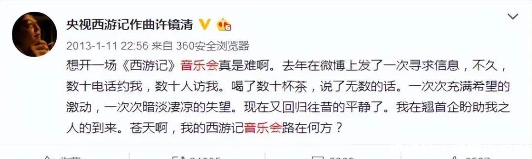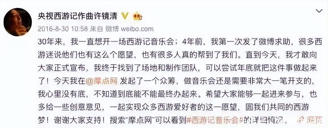 不但如斯,许镜清一直念念要洽商《西纪行》音乐会,可因为莫得钱,只可向网友众筹。这样多年昔时了,许镜清过得怎么了?