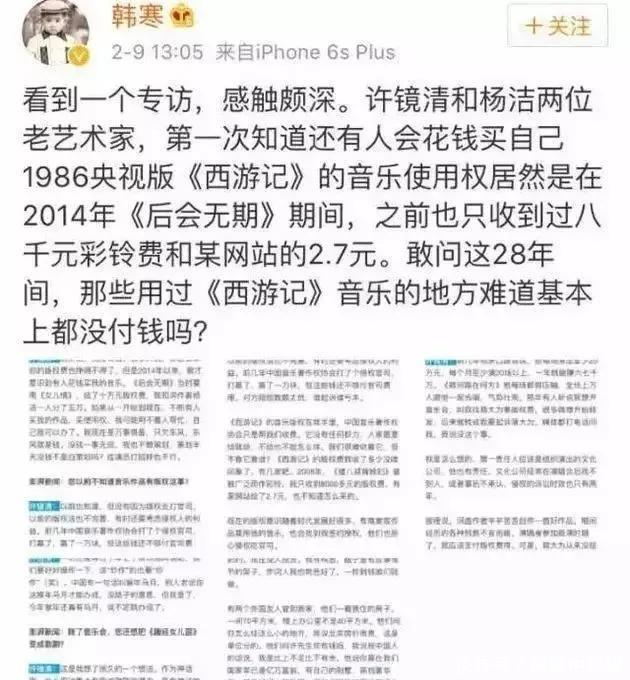 2014年,在电影《后会无期》的插曲中,出现了《男儿情》。因为要用这首曲子,韩寒便向许镜清支付了3万块钱的版权费,这也让许镜清知说念了还有版权费。为此,韩寒也顺利在微博上为许镜清抱起义。