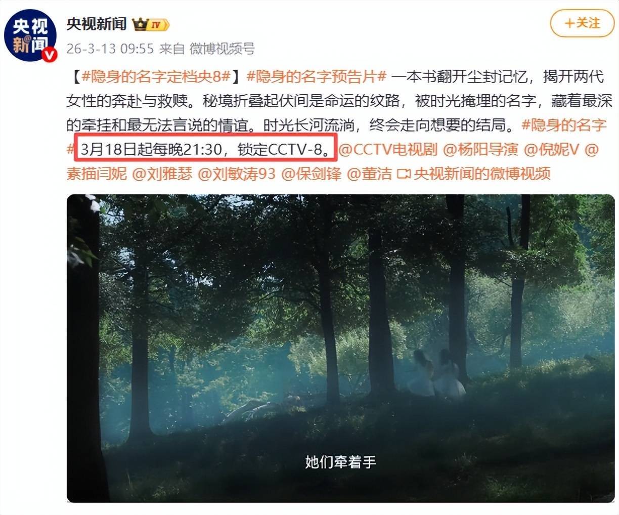就在今天,《隐身的名字》崇拜定档于3月18日央八开播,鹅厂全网独播。