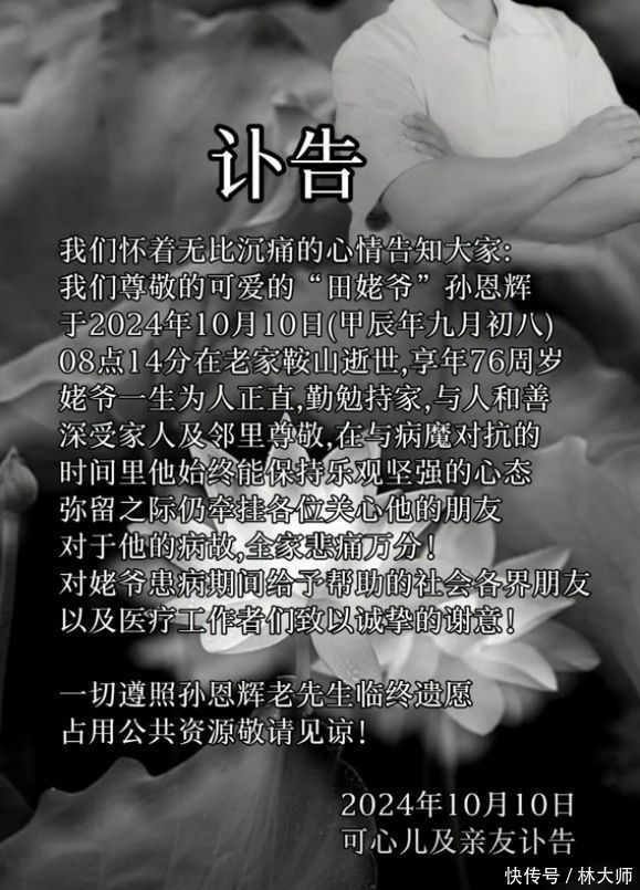 终末,但愿田姥爷一齐走好,愿天国莫得病痛,但愿他来生再为全球带来欢声笑语。