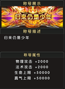 称号属性:物理袭击+2000,法术袭击+2000,生命上限+50000,真气上限+50000;