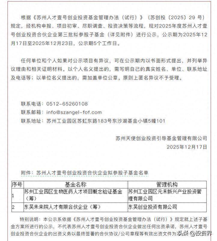 投资界(ID:pedaily2012)12月17日音讯,近日,苏州天神母基金发布公告,公示了2025年度苏州东谈主才壹号创业投资联合企业第三批拟参股子基金,母基金拟出资2支子基金,管制机构为苏州工业园区元禾新兴产业投资管制有限公司、东吴创业投资有限公司。