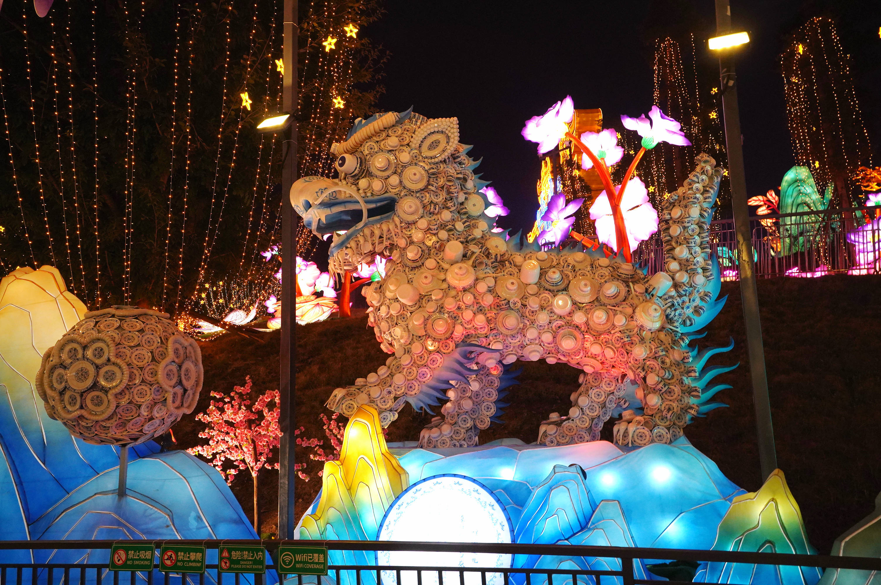 置身35米高的“华结映门”,眼睛短暂会堕入光影流转的海洋。扬眉吐气的花木兰身伴骏马,视力刚毅,发丝飘舞。全长210米、高达32米的鲲鹏展翅翱翔,扶摇直上,《庄子·汗漫游》中的纵脱假想成为魔幻实景。更有以“山海经”为本来的神兽彩灯,1.5万根辣椒拼接的火凤凰羽翼如晚霞凝固,4.6万个回收药瓶重塑的水麒麟流光溢彩,2千斤手割稻草精选制作而成的“金毛吼”气概出奇。