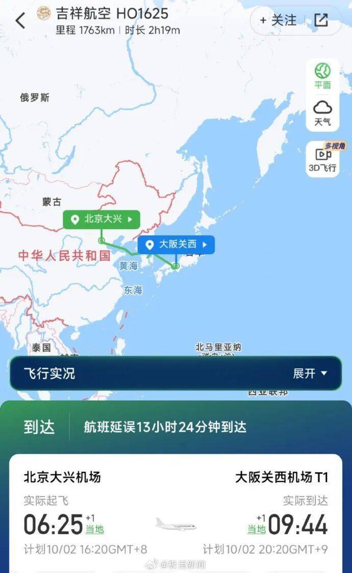 据“航旅纵横”裸露,最终HO1625航班于3日朝晨6时25分升起,当地时辰9时44分到达大阪,延误13小时24分钟到达。